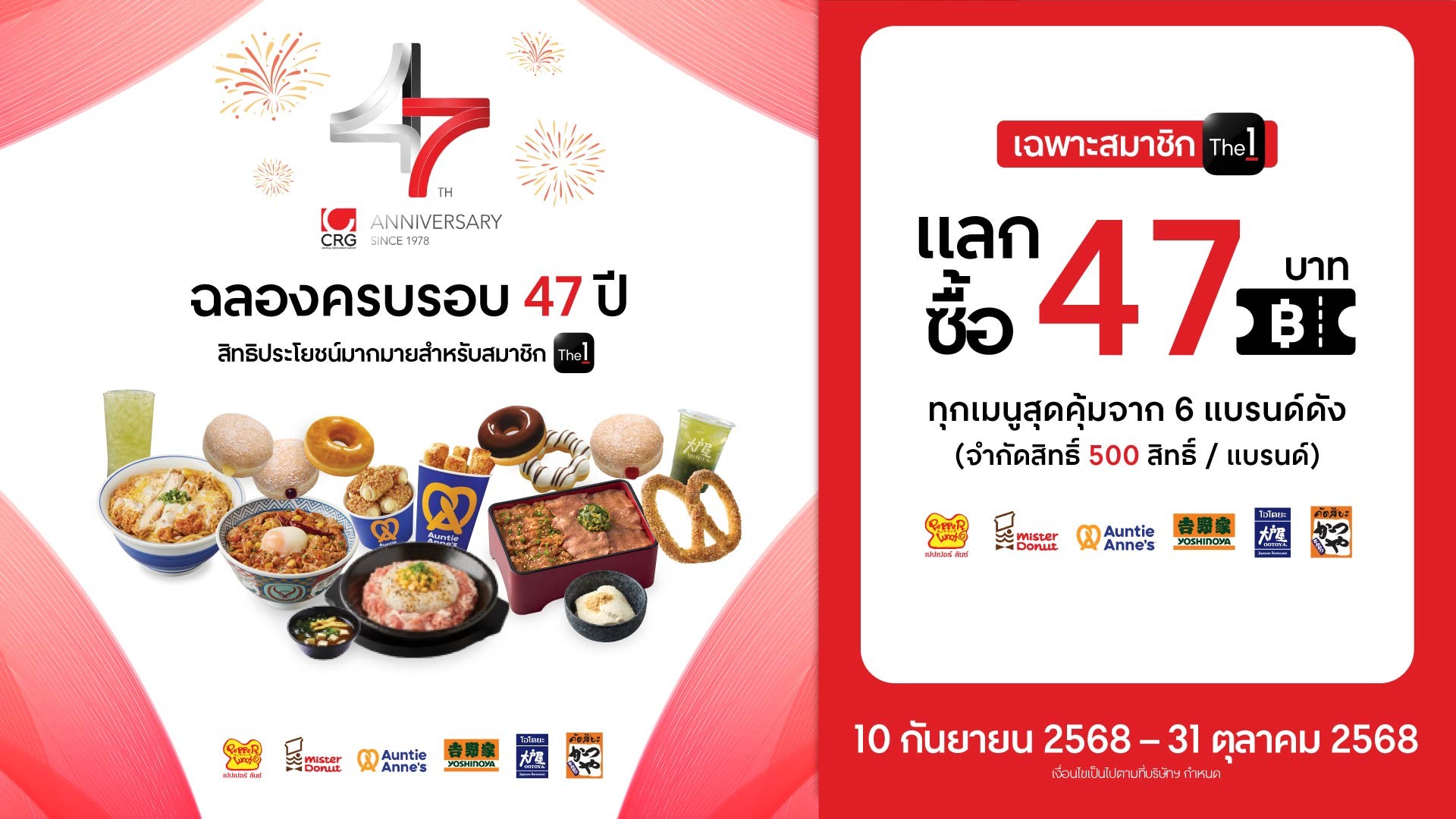 บริษัท เซ็นทรัล เรสตอรองส์ กรุ๊ป จำกัด (ซีอาร์จี : CRG) ผู้นำธุรกิจร้านอาหารเครือข่าย (Food Chain Industry) ของประเทศไทย ฉลองครบรอบ 47 ปี จัดแคมเปญ “CRG Anniversary 47th x The 1” โดยผนึกกำลังกับ The 1 พันธมิตรรายสำคัญ มอบสิทธิประโยชน์สำหรับลูกค้าคนพิเศษของ ซีอาร์จี และ สมาชิก The 1 เพื่อเป็นของขวัญแทนคำขอบคุณ เพียงแลก 800 คะแนน ซื้อเมนูสุดคุ้มในราคา 47 บาท จาก 6 แบรนด์ดัง ได้แก่ Mister Donut, Auntie Anne’s, Pepper Lunch, Yoshinoya, Ootoya และ Katsuya ตั้งแต่วันที่ 10 กันยายน – 31 ตุลาคม 2568 ผ่านทาง The 1 Application เท่านั้น