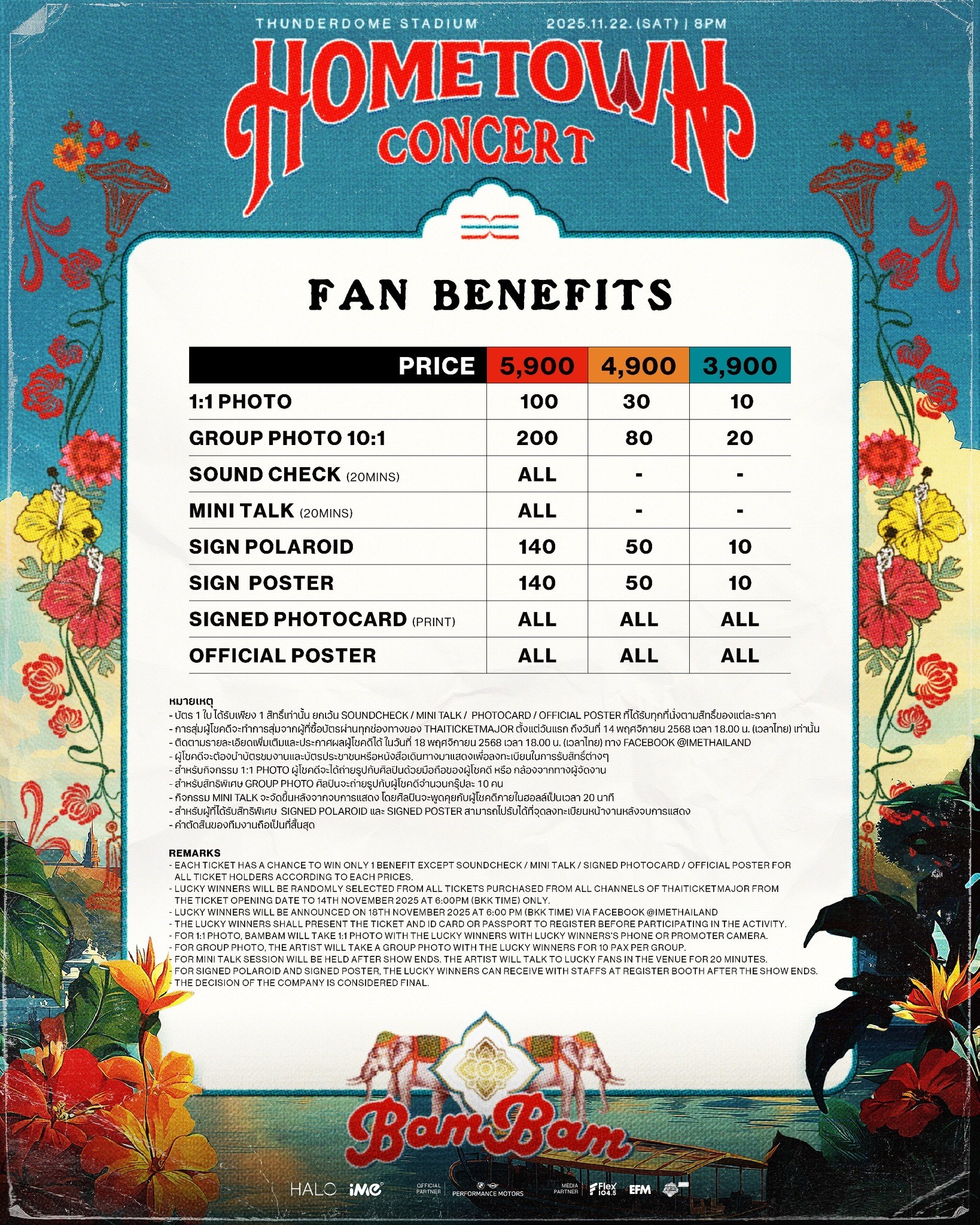 ความปังของ “แบมแบม” ไม่มีคำว่าถอย มีแต่พุ่งขึ้นเรื่อยๆ และในคอนเสิร์ตใหญ่ครั้งนี้เจ้าตัวก็ทุ่มเทสุดหัวใจ เพื่อมอบโชว์ที่ดีที่สุดให้กับแฟนๆ ในบ้านเกิดที่เขารักที่สุด “HOMETOWN” ที่มีความทรงจำ ความผูกพัน และผู้คนที่รักแบมแบมอย่างล้นหลาม! แฟนคลับห้ามพลาดมาเป็นส่วนหนึ่งของ “2025 BamBam HOMETOWN Concert in Bangkok” เพราะอะไรที่คุณคิดว่าอาจจะไม่มี อาจจะมีมากกว่าที่คิด! อะไรที่คิดว่าจะไม่ได้เห็น เตรียมเห็นแบบจัดเต็ม! และเซอร์ไพรส์ที่ไม่คาดคิด อาจจะเกิดขึ้นเฉพาะที่นี่..ที่เดียวเท่านั้น