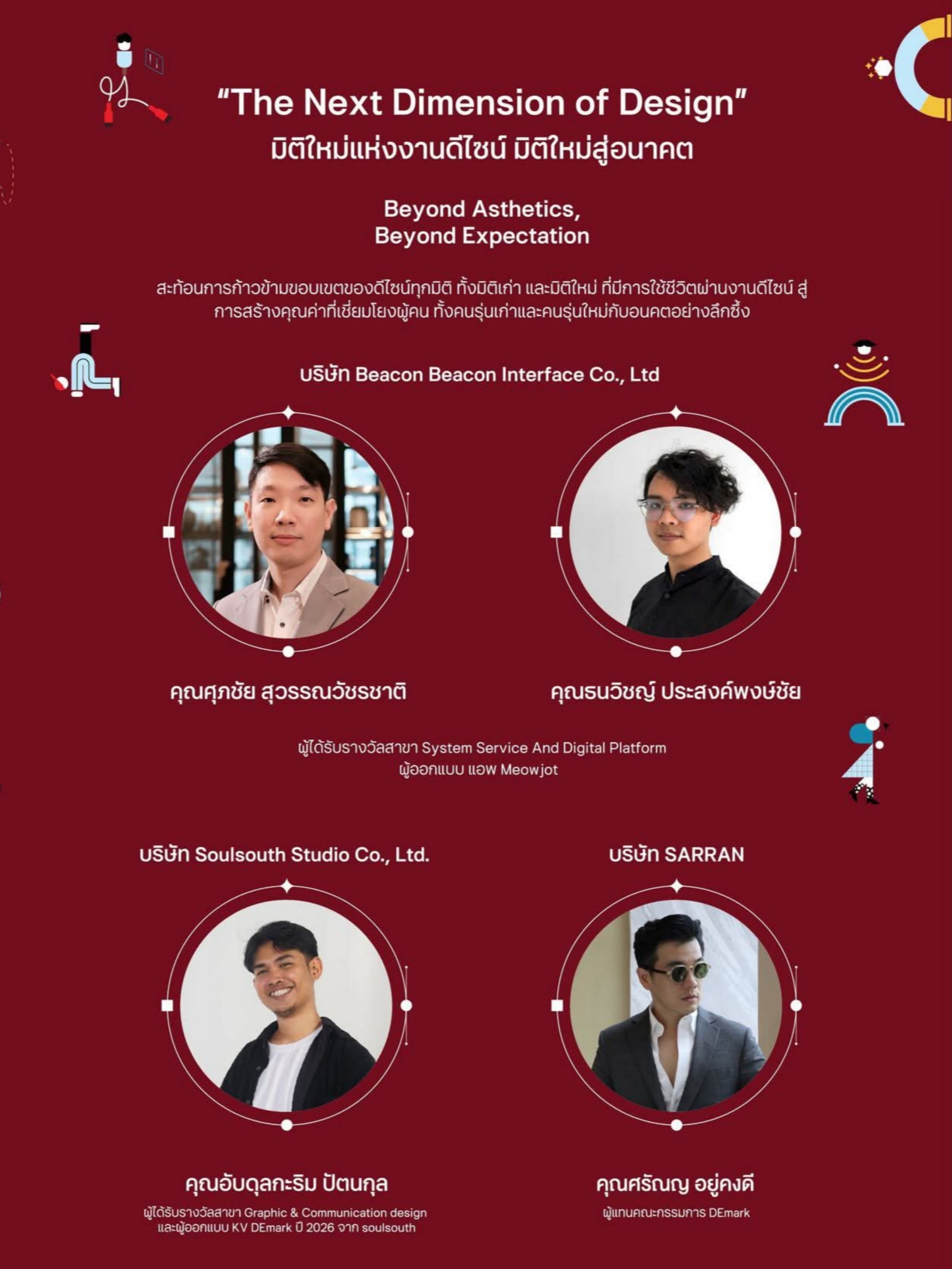 นอกจากนี้ ภายในงานแถลงข่าวยังได้มีเสวนาพิเศษในหัวข้อ “The Next Dimension of Design” มิติใหม่แห่งงานดีไซน์ มิติใหม่สู่อนาคต: Beyond Asthetics, Beyond Expectation โดยเจ้าของผลงานที่ได้รับรางวัล DEmark อันประกอบด้วย; คุณศุภชัย สุวรรณวัชรชาติ และคุณธนวิชญ์ ประสงค์พงษ์ชัย บริษัท บีคอน อินเตอร์เฟซ จำกัด เจ้าของผลงานที่ได้รับรางวัล DEmark สาขา System Service And Digital Platform จากแอปพลิเคชันเหมียวจด (MeowJot), คุณอับดุลกะริม ปัตนกุล บริษัท โซลเซาท์ สตูดิโอ จำกัด เจ้าของผลงานที่ได้รับรางวัล DEmark สาขา Graphic & Communication Design และยังเป็นผู้ออกแบบคอนเซปต์หลัก (Key Visual) ของการประกวดรางวัล DEmark ประจำปี 2026, และคุณศรัณญ อยู่คงดี จิวเวลรี่ดีไซเนอร์แบรนด์ SARRAN และเป็นหนึ่งในคณะกรรมการพิจารณาตัดสินรางวัล DEmark 2026