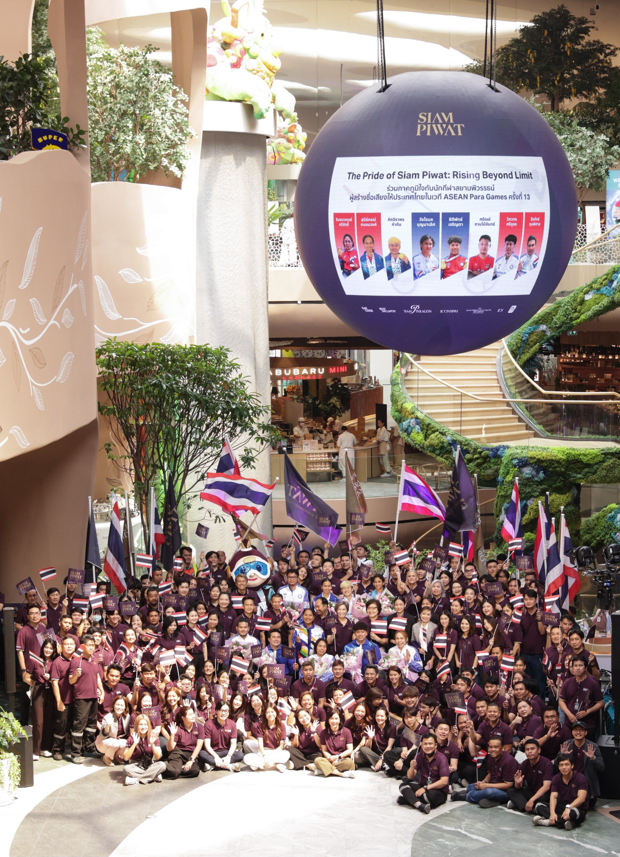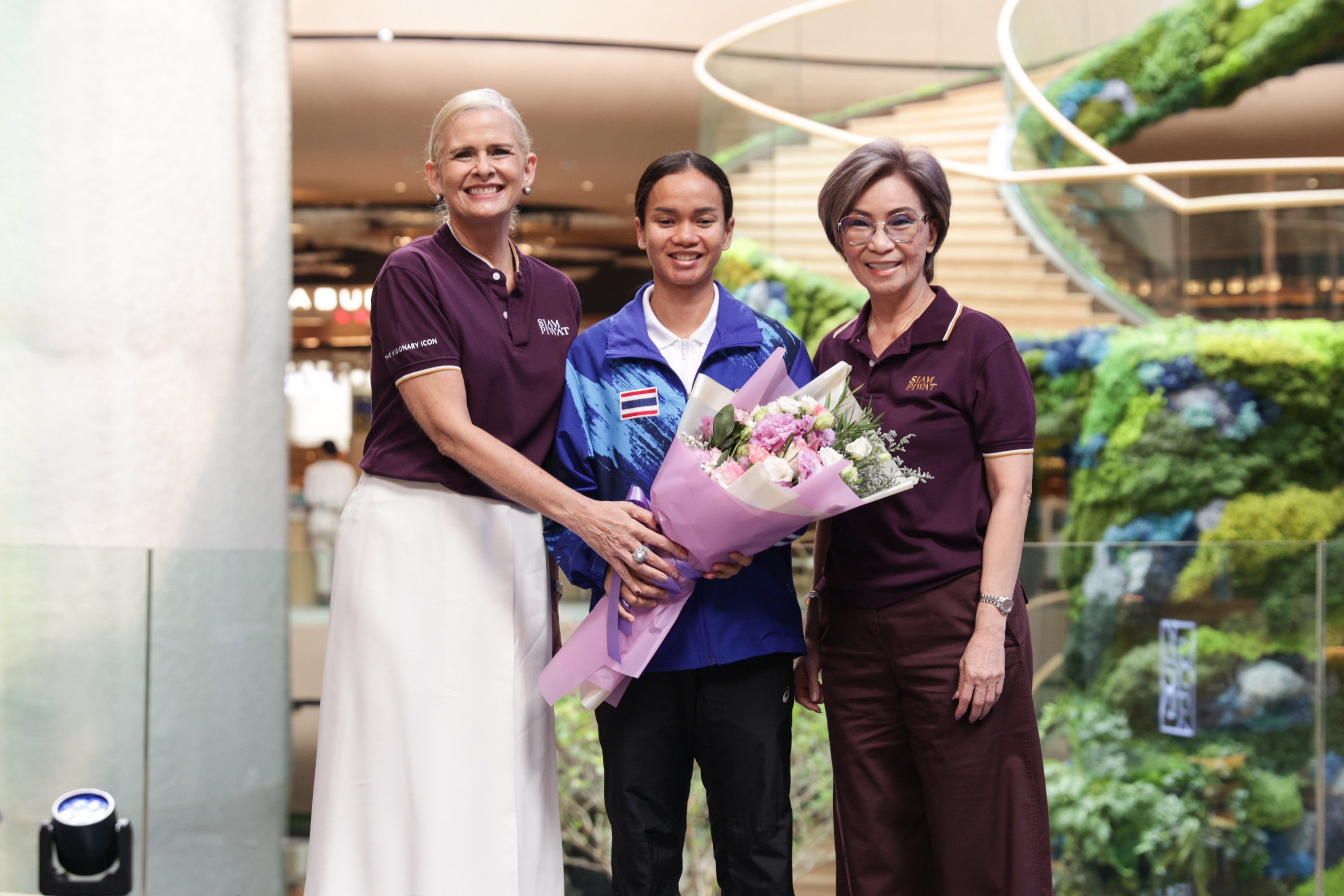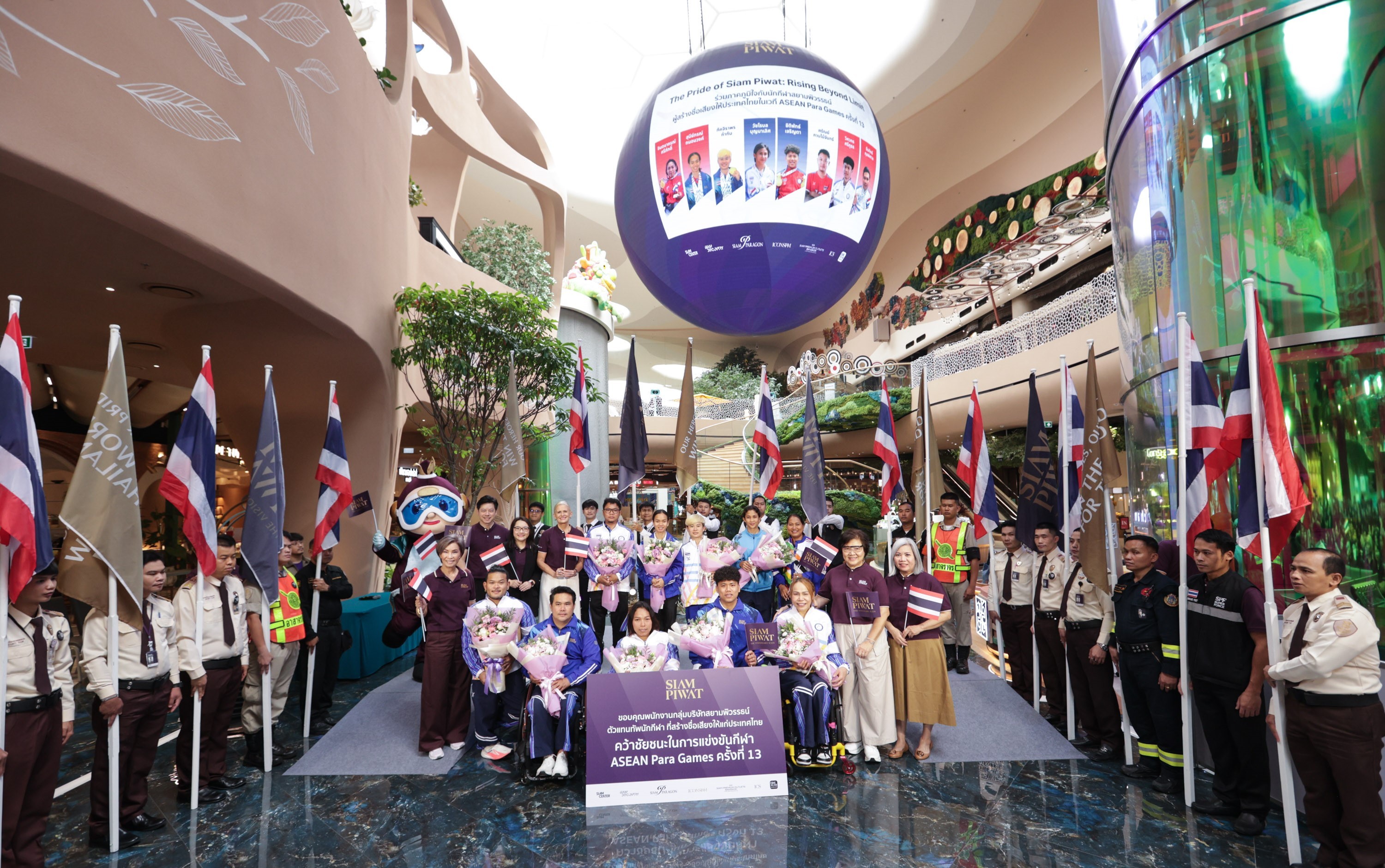 สยามพิวรรธน์ได้จัดงานต้อนรับเพื่อเป็นการให้เกียรติและยกย่องถึงความมุ่งมั่นที่ได้เป็นตัวแทนในนามของคนไทย และสามารถคว้าชัยชนะในการแข่งขันกีฬาระดับนานาชาติด้วยความภาคภูมิ โดยมีคณะผู้บริหารและพนักงานของกลุ่มบริษัทฯ พร้อมด้วยลูกค้าและประชาชน ร่วมกันให้การต้อนรับขบวนนักกีฬาบริเวณชั้น 5 สยามพารากอน ระหว่างขบวนนักกีฬาเดินเข้าสู่พิธี ภายในพื้นที่ NEXTOPIA เมืองต้นแบบแห่งโลกอนาคต ซึ่งเป็นแลนด์มาร์กแห่งใหม่ใจกลางกรุงเทพมหานครที่นำเอาแนวคิดอารยสถาปัตย์เพื่อคนทั้งมวลมาใช้ผสมผสานในการออกแบบครบทุกมิติ เพื่อให้ทุกคนได้ร่วมกันสัมผัสประสบการณ์ใหม่ของคอมมูนิตี้ที่พร้อมเปิดรับคนทุกเพศ ทุกวัย และทุกสภาพร่างกาย สามารถเข้าถึงได้อย่างสะดวกและเป็นมิตร