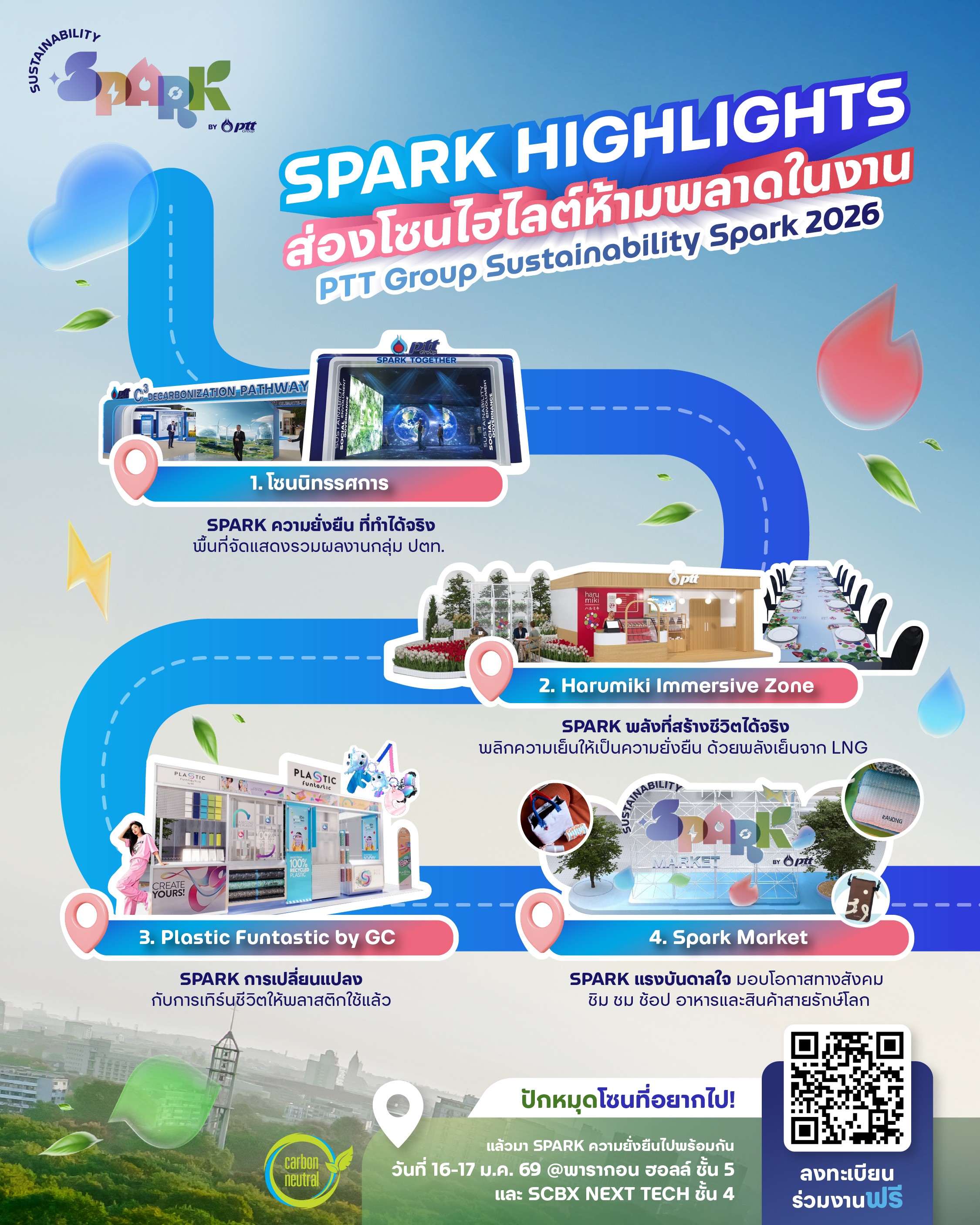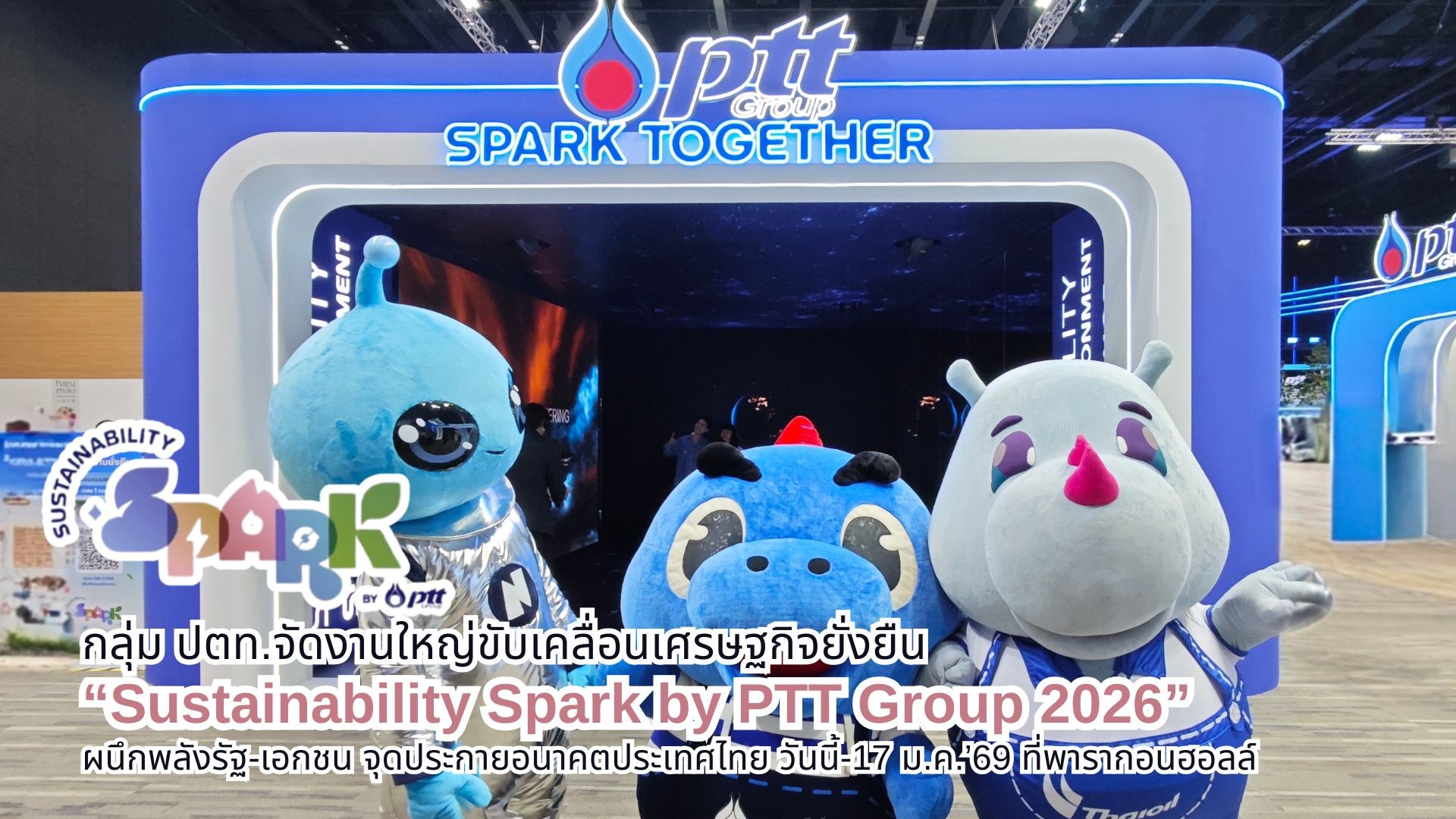 กลุ่ม ปตท.ขอเชิญผู้สนใจทุกท่านร่วมเป็นส่วนหนึ่งของการจุดประกายอนาคตที่ยั่งยืนในงาน “Sustainability Spark by PTT Group 2026: Sparking the Future พลังจุดประกายอนาคต” ระหว่างวันที่ 16-17 มกราคม 2569 นี้ ณ พารากอน ฮอลล์ ชั้น 5 และ SCBX NEXT TECH ชั้น 4 ศูนย์การค้าสยามพารากอน (SiamParagon) โดยสามารถลงทะเบียนร่วมงาน (ไม่มีค่าใช้จ่าย) ได้ที่ https://www.SustainabilitySpark.com