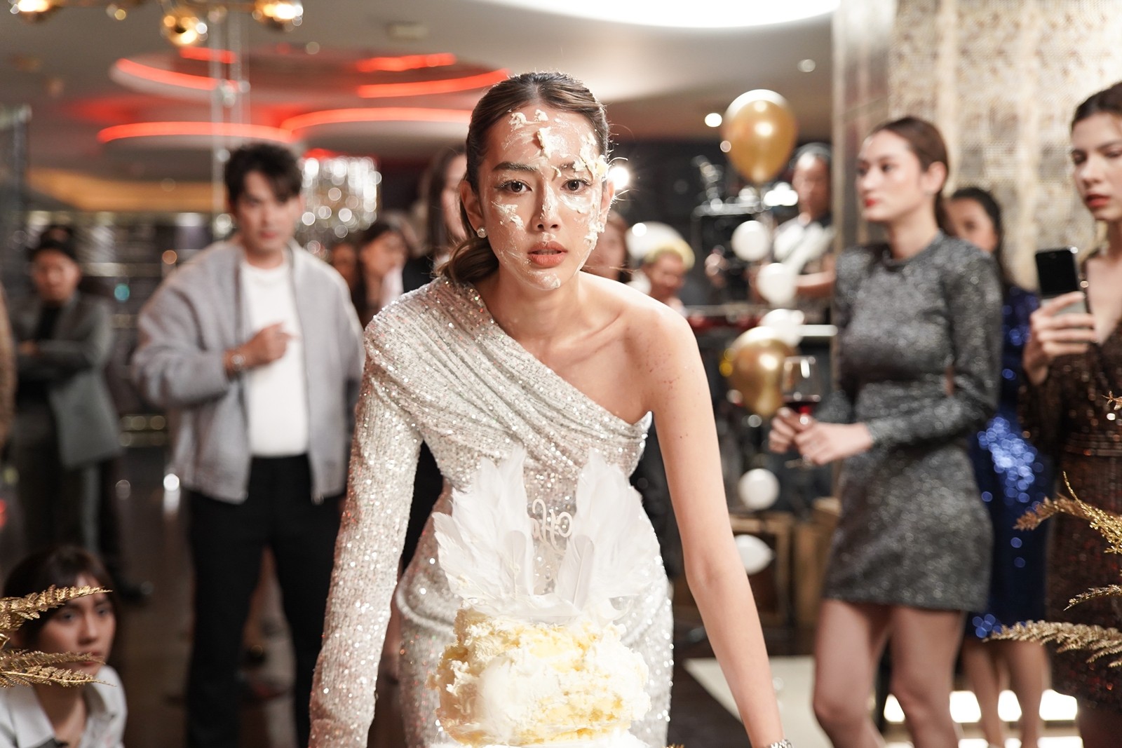 เรียกว่าเป็นอีกฉากที่แก๊ปต้องทุ่มสุดตัว ยอมให้เค้กเลอะหน้าจริงเพื่อถ่ายทอดอารมณ์โกรธปนอับอายออกมาได้อย่างสมบูรณ์แบบ ขณะที่เก๋ไก๋ก็ต้องยอมเละเทะและเปียกปอนไปทั้งตัวเพื่อให้ภาพออกมาสมจริงที่สุด ถือเป็นอีกฉากที่คนดูจะต้องลุ้นระทึกและสะใจไปกับความพยายามจะร้ายแต่ดันพ่ายภัยตัวเองของแก๊ปจริงๆ