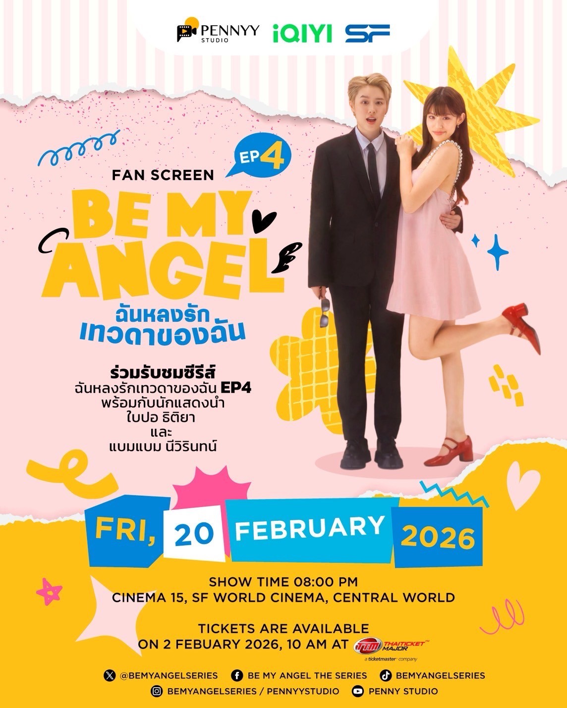 โดยงาน Be My Angel FAN Screen EP.4 จะจัดขึ้นในวันศุกร์ที่ 20 กุมภาพันธ์ 2569 เวลา 18.30 น. ณ โรงภาพยนตร์ SF World Cinema Central World โรง 15 โดยแฟนซีรีส์จะได้ร่วมรับชม EP.4 ที่เข้มข้นขึ้น กับตอน "ฉันต้องไปล่าท้าผีกับเทวดาของฉัน” ชื่อก็บอกแล้วว่าต้องมีอะไรสนุก ๆ แน่นอน เมื่อการสืบตัวตนของซีกระจ่างขึ้นเรื่อย ๆ พวกเขาต้องเจอกับเจ้าของรายการนอนกับผี ทั้งคู่จะต้องทำภารกิจหลอนบางอย่างที่รับรองความสนุกสุดป่วน และที่สำคัญความพิเศษของ Episode นี้ ยังเสิร์ฟโมเมนต์หวานๆ ที่พร้อมจะพาทุกคนอินไปกับความสัมพันธ์ของเจนกับซีที่กำลังพัฒนาขึ้นเรื่อย ๆ เรียกได้ว่าต้องฟินจิกหมอนกันทั้งโรงภาพยนตร์ อยากชวนทุกคนมาฟินและกรี๊ดไปพร้อมกับนักแสดงนำ แบมแบม-นีวิรินทน์ ลิ่มกังวาฬมงคล และ ใบปอ-ธิติยา จิระพรศิลป์ พร้อมด้วย แยม-มทิรา ตันติประสุต ในบรรยากาศสุดเอ็กซ์คลูซีฟ ที่อัดแน่นไปด้วยเคมีความอบอุ่น