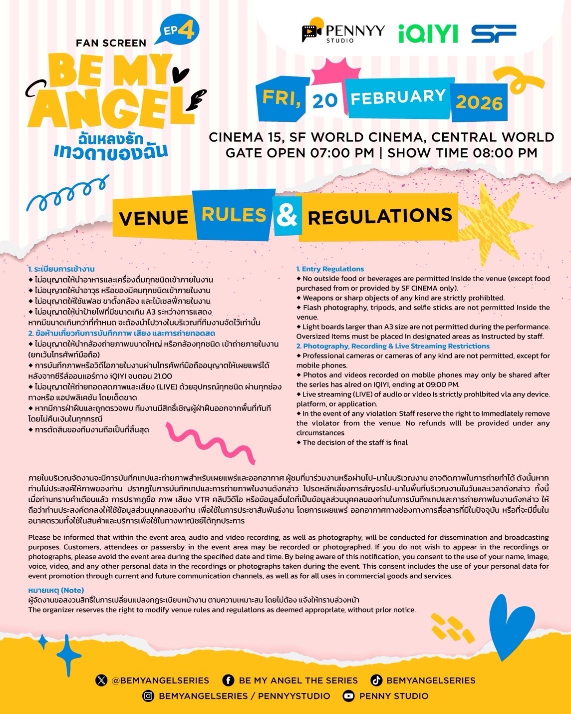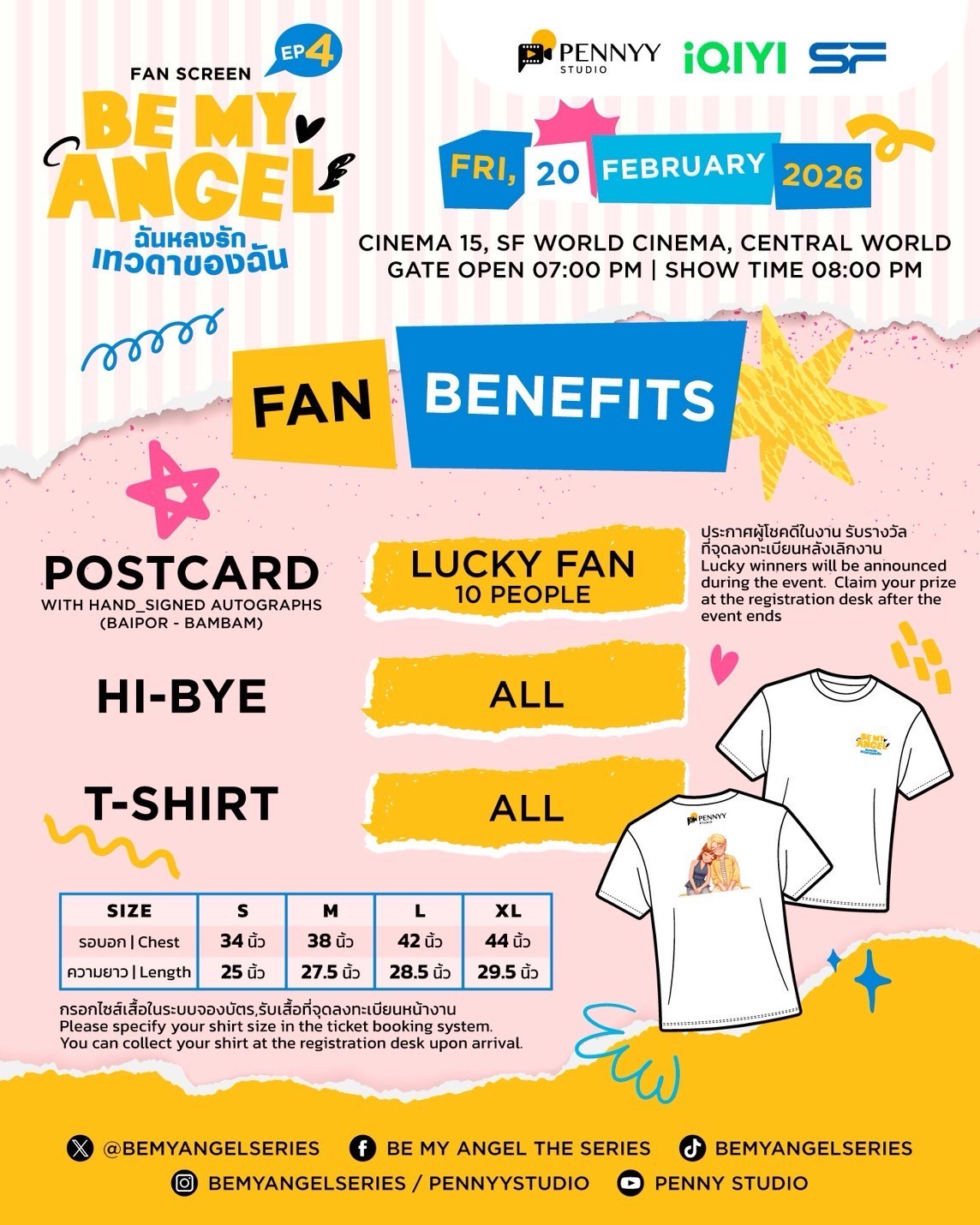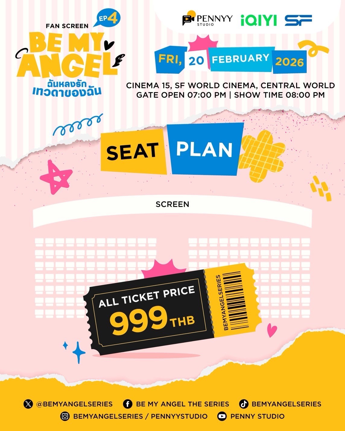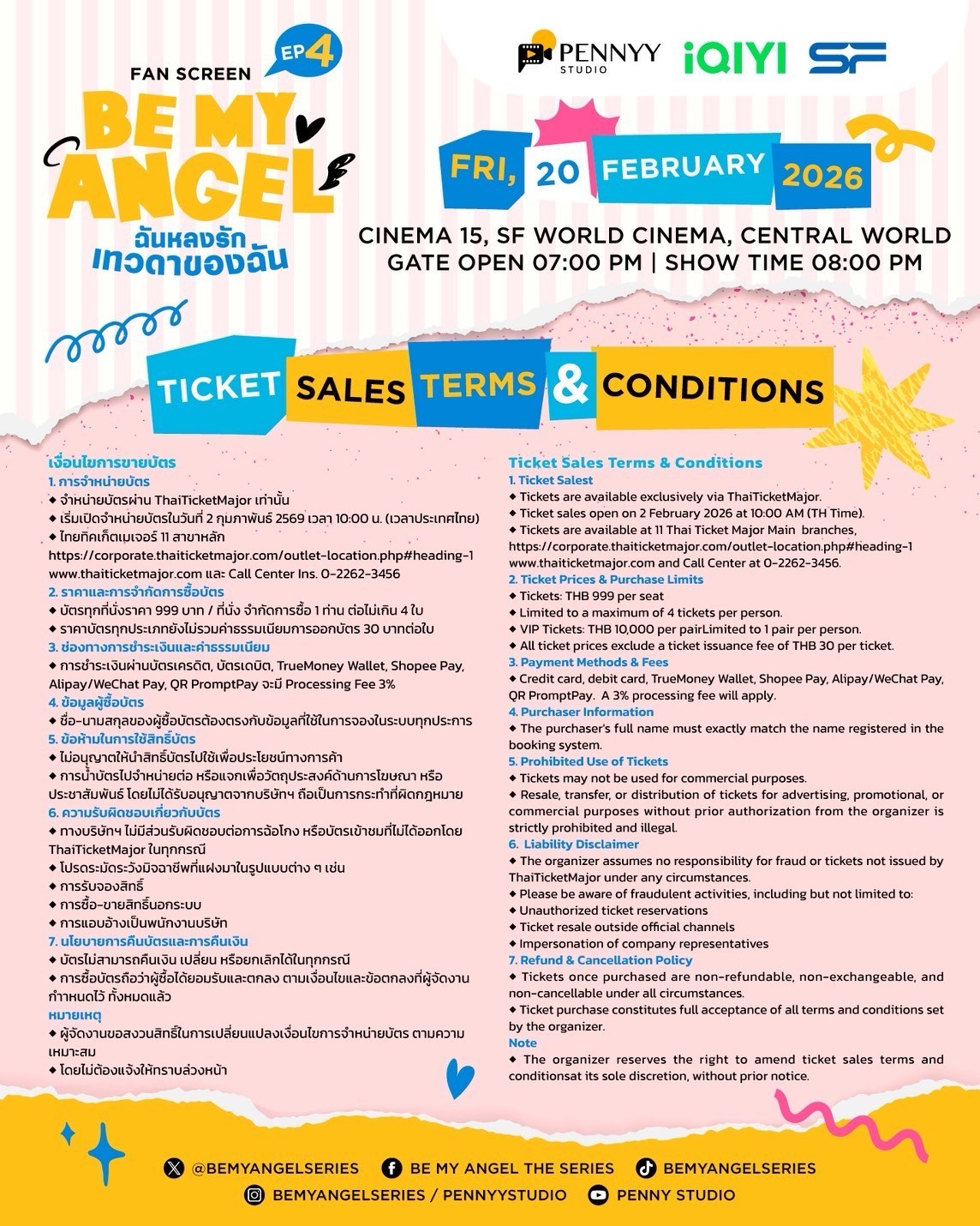 ติดตามรายละเอียดเพิ่มเติมของงาน Be My Angel FAN Screen EP.4 ได้ทุกช่องทางของ BeMyAngelSeries และ PennyStudio ซื้อบัตรได้ที่ ไทยทิคเก็ตเมเจอร์ 11 สาขาหลัก และ ทาง www.thaiticketmajor.com และ Call Center โทร. 02-262-3456