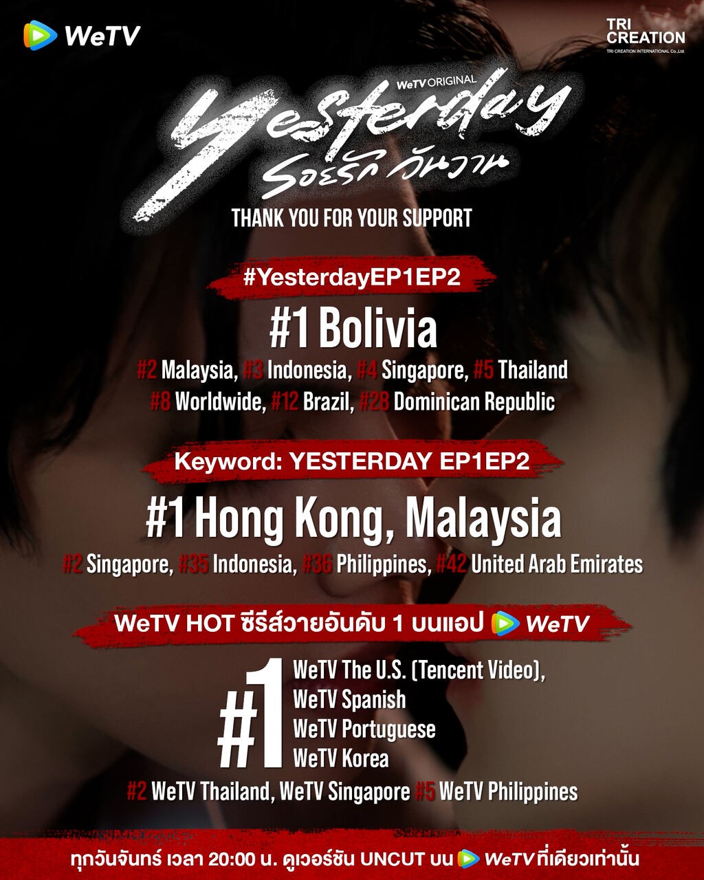 เรียกว่ากลับมาครั้งนี้ไม่ทำให้แฟน ๆ ผิดหวัง สำหรับสองนักแสดงมากฝีมือ ฟอร์ด ฐิติพงศ์ และ พีท วสุธร ที่ทุ่มสุดตัวในบทบาทสุดท้าทายของซีรีส์วายโรแมนติก-ดราม่าฟอร์มยักษ์แห่งปี WeTV Original “Yesterday รอยรักวันวาน” พร้อมสร้างปรากฏการณ์ตั้งแต่ครั้งแรกที่ออกอากาศ ด้วยกระแสตอบรับถล่มทลายทั้งในไทยและต่างประเทศ โดยเฉพาะฉากไฮไลต์อย่าง “ซีนรถแดง” ที่กลายเป็นไวรัลทั่วไทม์ไลน์ และส่งแรงหนุนให้ซีรีส์ทะยานสู่อันดับ 1 บนแอป WeTV ในหลายพื้นที่ ได้แก่ The U.S. (Tencent Video), Spanish, Portuguese และ Korea อันดับ 2 ใน Thailand และ Singapore และ อันดับ 3 ใน Philippines สะท้อนความแรงระดับอินเตอร์อย่างแท้จริง ไม่เพียงเท่านั้น แฮชแท็ก #YesterdayEP1EP2 และคีย์เวิร์ด YESTERDAY EP1EP2 ยังติดเทรนด์ X ในหลายประเทศทั่วโลก ทั้ง Worldwide, Thailand, Bolivia, Malaysia, Indonesia, Singapore, Brazil, Dominican Republic, Hong Kong และ United Arab Emirates ตอกย้ำความฮอตตั้งแต่เปิดตัว สมศักดิ์ศรีซีรีส์คุณภาพจาก WeTV Original