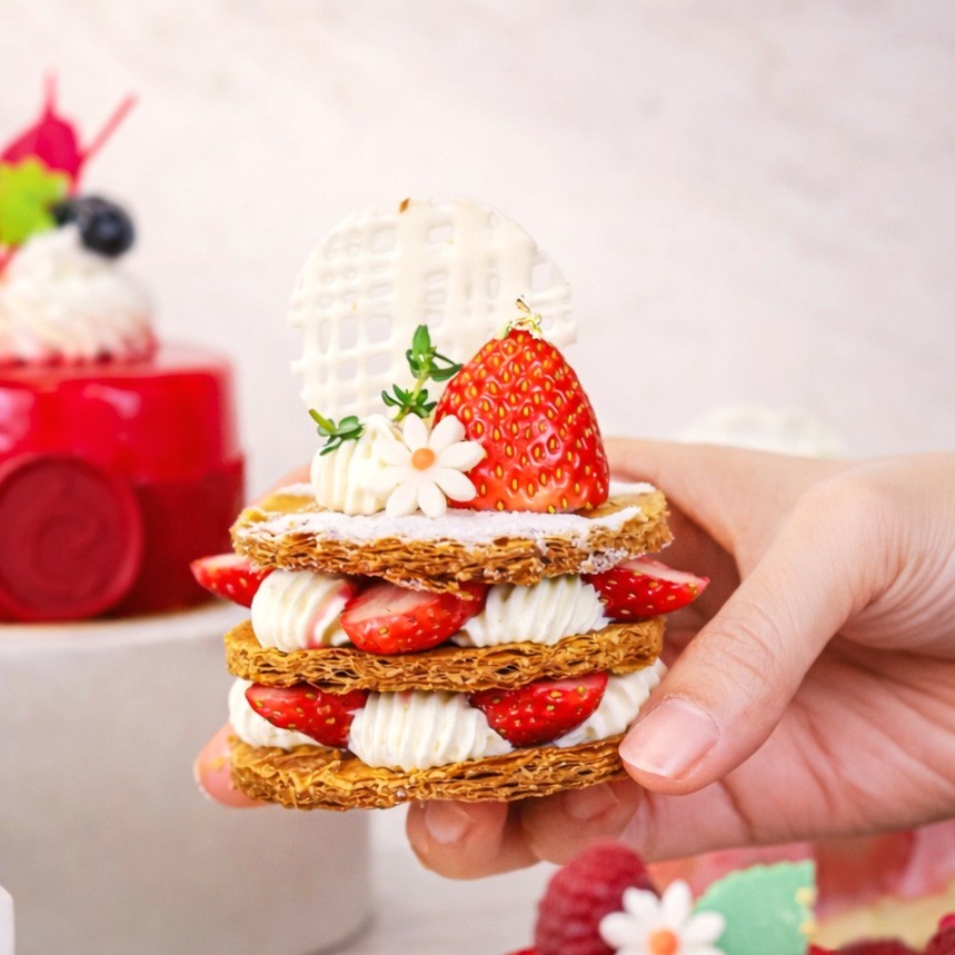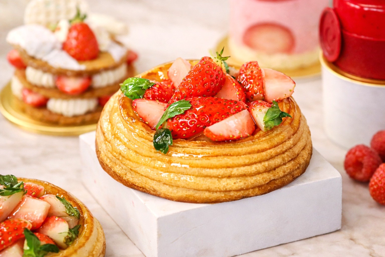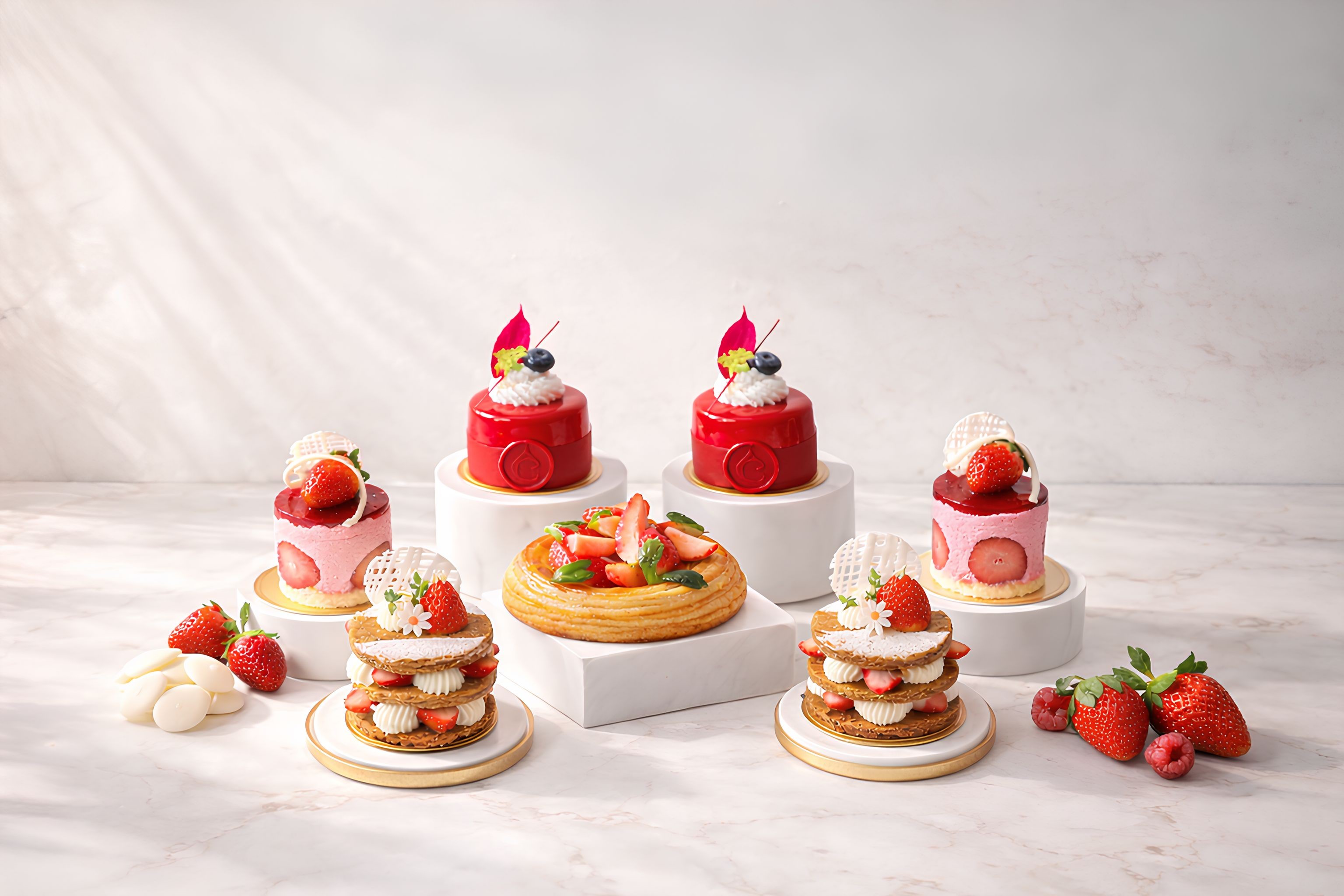 The Valentine’s Dessert Set showcases a delightful selection of strawberry-inspired creations, prepared using premium ingredients and refined pastry techniques. The assortment includes Strawberry Shortcake, Strawberry Mille-Feuille, Strawberry Mousse Cake, Strawberry Cheesepie, Fresh Strawberry Danish, and Fresh Strawberry Tarte Tatin. Each dessert offers a harmonious balance of sweetness and aroma, complemented by delicate presentation that captures the romantic spirit of Valentine’s Day.