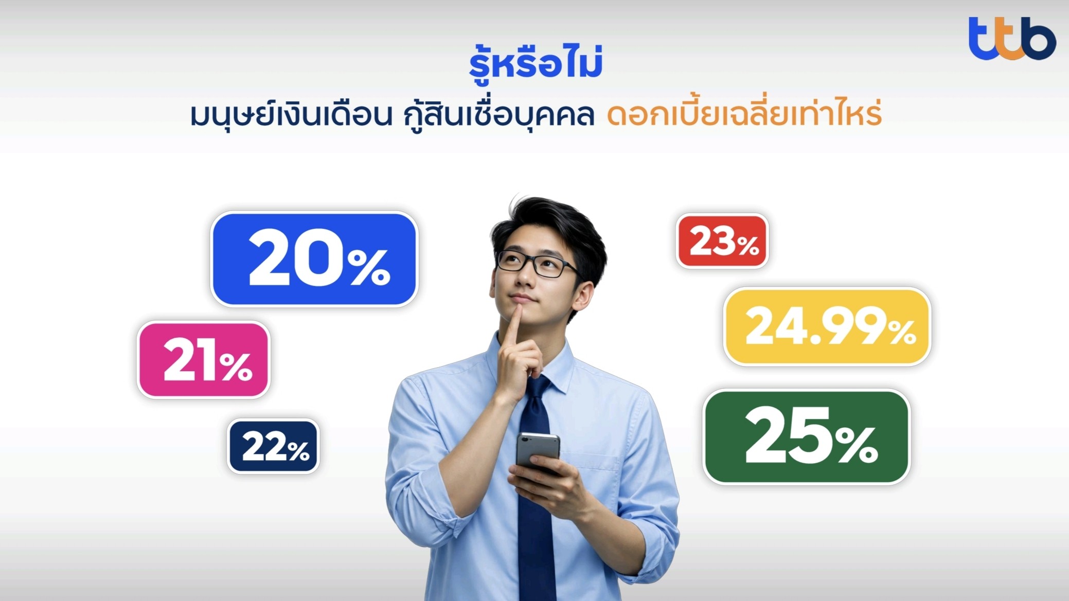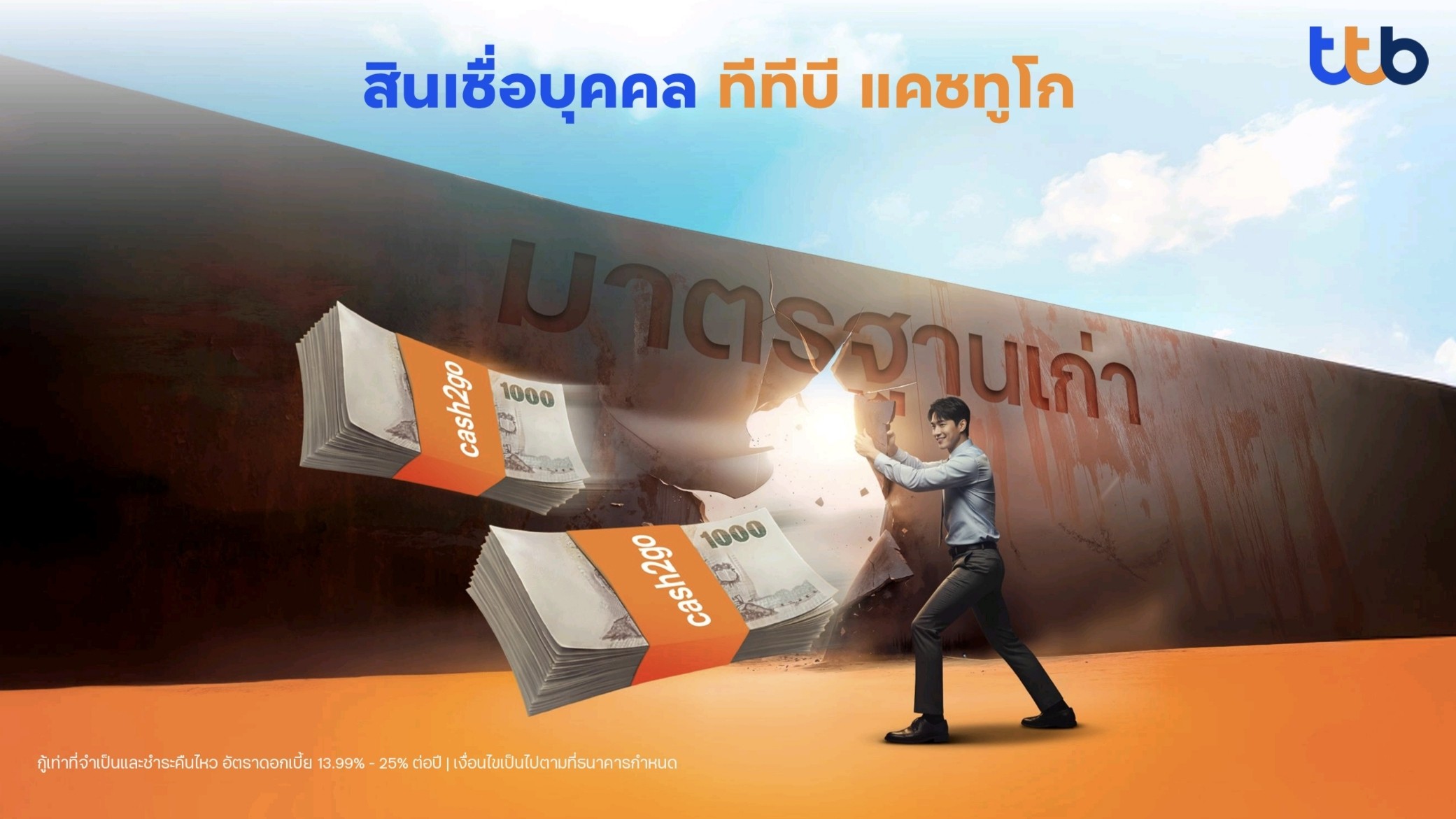 *ทีทีบีมีความมุ่งมั่นส่งเสริมให้ลูกค้าสามารถจัดการหนี้ได้อย่างมีประสิทธิภาพและยั่งยืน ภายใต้หลักเกณฑ์การให้สินเชื่ออย่างรับผิดชอบและเป็นธรรม (Responsible Lending) ของธนาคารแห่งประเทศไทย พร้อมสนับสนุนลูกค้ากู้เท่าที่จำเป็นและชำระคืนไหว สำหรับสินเชื่อบุคคล ทีทีบี แคชทูโก อัตราดอกเบี้ย 13.99% - 25% ต่อปี โดยเงื่อนไขเป็นไปตามที่ธนาคารกำหนด ทั้งนี้ สมมติฐานการคำนวณข้างต้น มาจากวงเงินกู้ 100,000 บาท เป็นระยะเวลา 72 งวด โดยเปรียบเทียบระหว่างกรณีดอกเบี้ย 23% ต่อปี ค่างวด 2,580 บาท/เดือน คิดเป็นดอกเบี้ยทั้งสัญญา 84,587 บาท และดอกเบี้ย 18% ต่อปี ค่างวด 2,290 บาท/เดือน คิดเป็นดอกเบี้ยทั้งสัญญา 63,699 บาท จึงมีส่วนต่างดอกเบี้ย 20,888 บาท