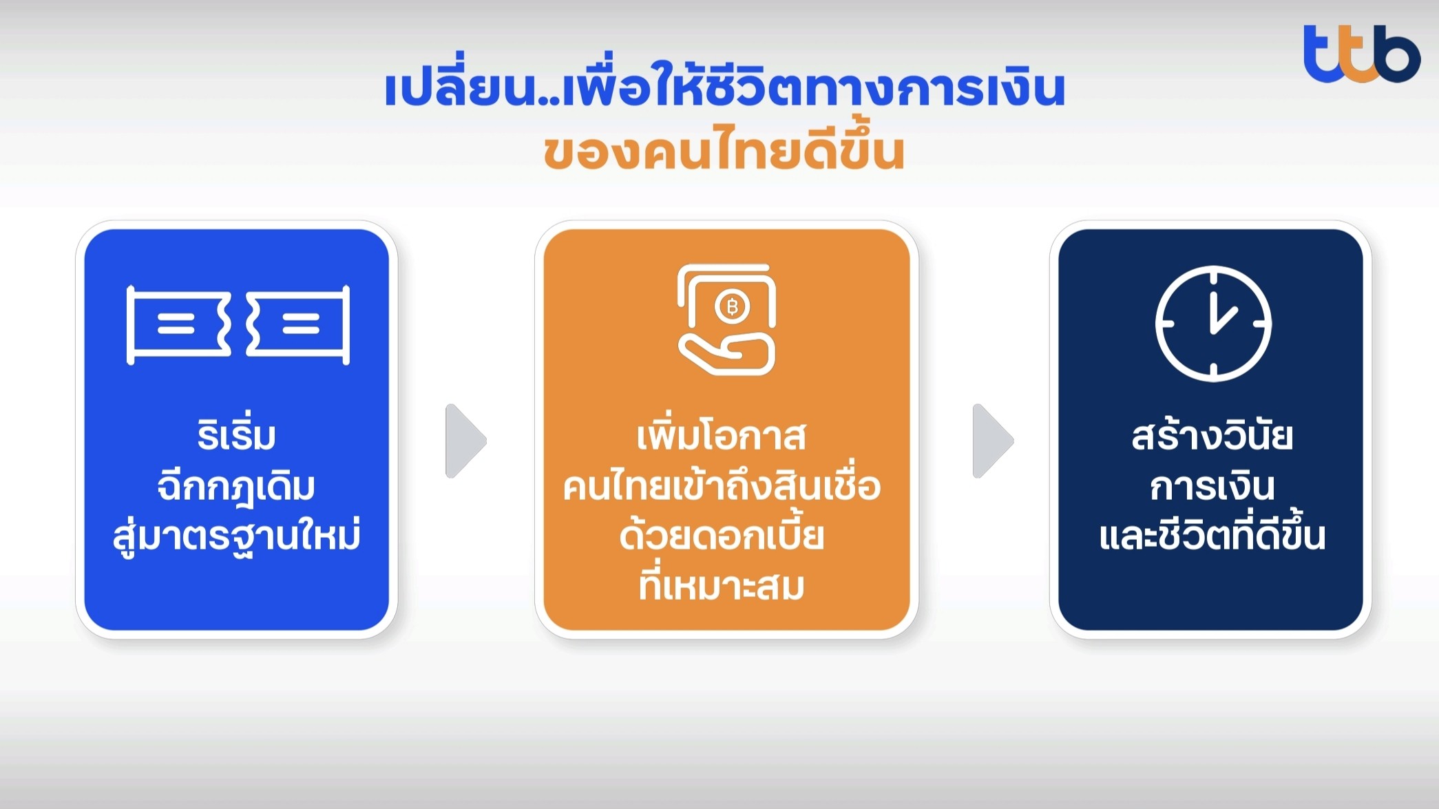 “กลุ่มทีทีบี (ttb) ตั้งเป้าหมายช่วยเหลือลูกค้าที่เครดิตดี เพื่อให้เข้าถึงสินเชื่อบุคคลด้วยอัตราดอกเบี้ยที่ดีผ่านสินเชื่อบุคคลทีทีบี แคชทูโก (ttb cash2go) วงเงินกว่า 15,000 ล้านบาทภายในปี 2569 โดยผลตอบรับเบื้องต้นหลังจากเริ่มนำเสนอให้กับลูกค้าประมาณ 1 เดือน มีลูกค้าถึง 70% และได้รับอนุมัติสินเชื่อด้วยอัตราดอกเบี้ยต่ำกว่าการคิดแบบเดิม ช่วยให้ลูกค้าลดภาระดอกเบี้ยลงได้ประมาณ 5% ต่อปี หรือเท่ากับประหยัดได้ประมาณ 20,000 บาทต่อการกู้เงินทุก 100,000 บาท”
