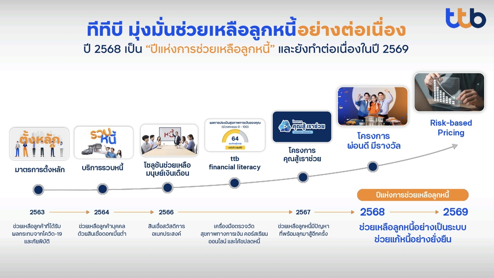 คุณฐากร ปิยะพันธ์ ผู้จัดการใหญ่ ธนาคารทหารไทยธนชาต จำกัด (มหาชน) เปิดเผยว่า “ตลอดหลายปีที่ผ่านมากลุ่มทีทีบี (ttb) มุ่งมั่นให้การช่วยเหลือลูกค้าสินเชื่ออย่างต่อเนื่อง เพื่อลดภาระการเงินและแก้หนี้อย่างยั่งยืนให้กับคนไทย โดยปีนี้กลุ่มทีทีบี (ttb) ยังคงเดินหน้าช่วยเหลือลูกหนี้ จะเห็นว่าปัญหาหนี้ครัวเรือนเป็นประเด็นสำคัญระดับประเทศที่น่ากังวลโดยเฉพาะสินเชื่อบุคคล ซึ่งข้อมูลจาก NCB ชี้ว่าเป็นหนี้ที่คนไทยมีมากที่สุดเป็นสัดส่วนถึง 43% ของหนี้ทั้งหมด และมีอยู่ในทุกช่วงอายุตั้งแต่วัยทำงานจนถึงวัยเกษียณ”