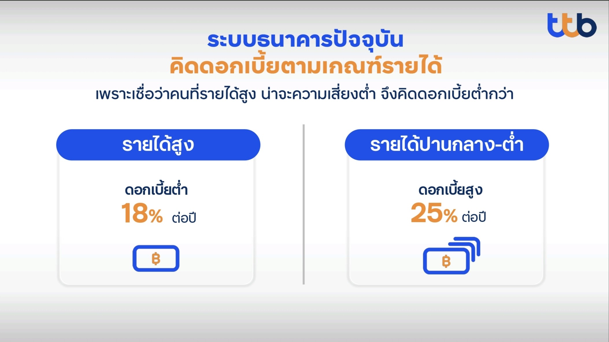 ธนาคารทหารไทยธนชาต จำกัด (มหาชน) หรือ ttb ประกาศความเป็นผู้นำในการสร้างมาตรฐานใหม่ให้กับวงการสินเชื่อบุคคลของไทย โดยฉีกกฎการคิดดอกเบี้ยจากเกณฑ์รายได้แบบเดิม สู่การพิจารณาจากคะแนนเครดิตและระดับความเสี่ยง (Risk-Based Pricing: RBP) กับลูกค้ารายบุคคลผ่านข้อมูลจากบริษัท ข้อมูลเครดิตแห่งชาติ จำกัด (NCB) ในการสร้างความเป็นธรรมและแม่นยำให้กับลูกค้าทุกคนมากขึ้น โดยนำร่องด้วยสินเชื่อบุคคลทีทีบี แคชทูโก (ttb cash2go) เพื่อหวังช่วยปลดล็อกแก้ปัญหาหนี้ครัวเรือน และมุ่งส่งเสริมคนมีวินัยทางการเงินให้มีชีวิตทางการเงินที่ดีขึ้นอย่างแท้จริง