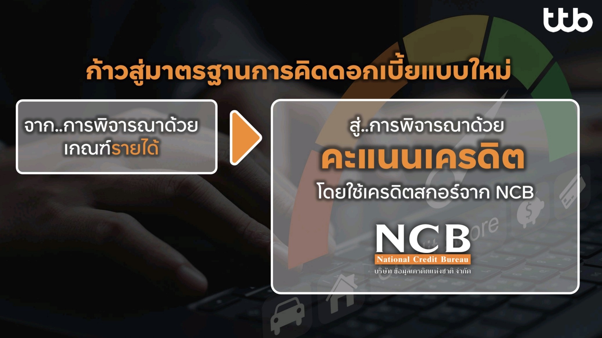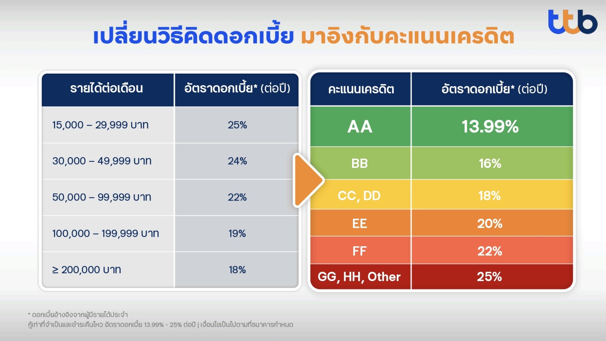 “ทั้งนี้ กลุ่มทีทีบี (ttb) มีความมุ่งมั่นที่จะส่งเสริมให้ลูกค้ามีชีวิตทางการเงินที่ดีอย่างยั่งยืน จึงขออาสาเป็นผู้นำริเริ่มแนวทางการพิจารณาระบบคิดอัตราดอกเบี้ยแบบใหม่ โดยนำร่องกับสินเชื่อบุคคลทีทีบี แคชทูโก (ttb cash2go) ซึ่งฉีกกฎสู่มาตรฐานใหม่กับ ‘ผ่อนดี เครดิตดี ดอกยิ่งดี’ ด้วยการเปลี่ยนวิธีคิดใหม่ จากการคิดดอกเบี้ยตามเกณฑ์ระดับรายได้ สู่การใช้ ‘คะแนนเครดิต’ (หรือเครดิตสกอร์) จาก NCB เป็นเกณฑ์ในการพิจารณาอัตราดอกเบี้ย เพื่อเพิ่มโอกาสให้คนไทยเข้าถึงสินเชื่อด้วยอัตราดอกเบี้ยที่เหมาะสม ซึ่งจะทำให้คนที่มีพฤติกรรมผ่อนดีจะมีคะแนนเครดิตดี และจะได้รับรางวัลเป็นอัตราดอกเบี้ยกู้ที่ลดลง หรือเรียกได้ว่าดีขึ้นกว่าเดิม สะท้อนถึงพฤติกรรมการชำระหนี้ของลูกค้าได้ชัดเจนขึ้น โดยอัตราดอกเบี้ยกู้เริ่มต้นเพียง 13.99% ต่อปีสำหรับผู้มีรายได้ประจำและเป็นอัตราดอกเบี้ยกู้คงที่เรตเดียวตลอดสัญญา จากเดิมที่อัตราดอกเบี้ยมักสูงถึง 25%”