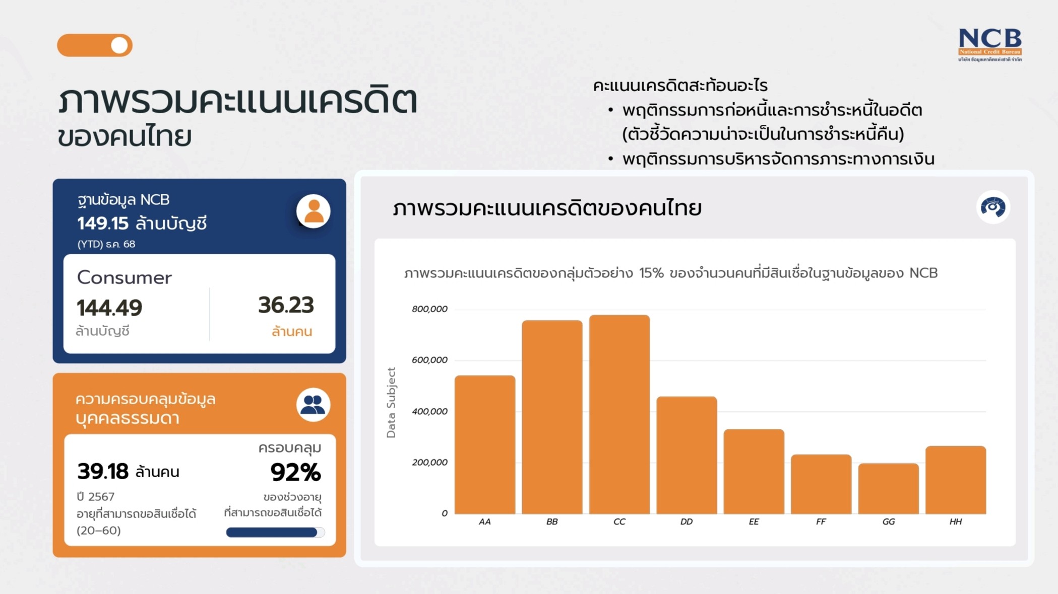 ดร.ลัษมณ อรรถาพิช ผู้จัดการใหญ่ บริษัท ข้อมูลเครดิตแห่งชาติ จำกัด (NCB) กล่าวว่า “NCB มีความยินดีที่คะแนนเครดิต (หรือเครดิตสกอร์) ได้ถูกนำมาใช้เป็นกลไกสำคัญในการกำหนดอัตราดอกเบี้ยตามระดับความเสี่ยง ซึ่งสอดคล้องกับบทบาทของ NCB ในการเป็นโครงสร้างพื้นฐานด้านข้อมูลเครดิตของประเทศ ที่ทำหน้าที่ประมวลผลข้อมูลพฤติกรรมทางการเงินให้ถูกนำไปใช้เพื่อการเข้าถึงสินเชื่อที่เหมาะสม”