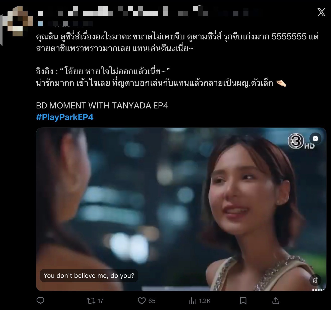 เรียกได้ว่า “Play Park รักไม่คาดฝัน” กำลังเข้าสู่ช่วงโค้งสำคัญที่ความสนุกเริ่มดีดให้คนดูลุ้นนั่งไม่ติด พร้อมคำถามที่ทุกคนอยากรู้ตอนนี้คือ…สุดท้ายแล้ว “คุณลิน” จะเลือกใคร ระหว่างความสัมพันธ์ในอดีต หรือความรักครั้งใหม่ที่ทำให้หัวใจเต้นแรงอีกครั้ง เอาใจช่วยไปพร้อมกัน 20 มีนาคมนี้ เวลา 20.30 น. ทางช่อง 3 ดูทีวีกด 33 ดูออนไลน์ที่ 3Plus ดูย้อนหลังทั่วโลกทาง 3Plus พร้อม Subtitle ภาษาอังกฤษ สมาชิก 3Plus Premium ดูย้อนหลังทุกวันศุกร์ เวลา 22.30 น. ลูกค้าทั่วไปดูย้อนหลังทุกวันอังคาร