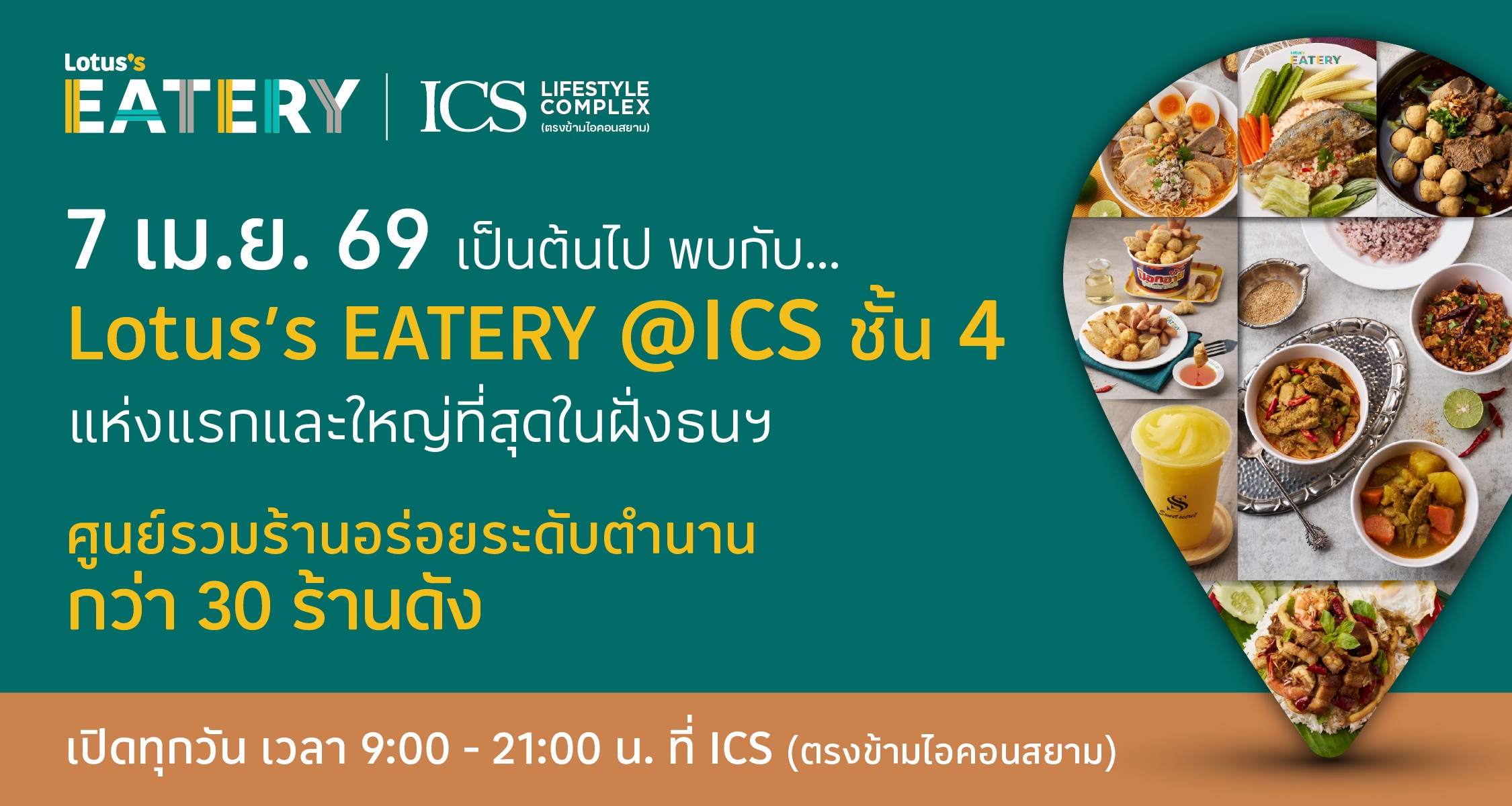 พบกับศูนย์รวมร้านอาหารดังระดับตำนานกว่า 30 แบรนด์กับศูนย์อาหารโลตัส อีทเทอรี (Lotus’s Eatery) สาขาใหม่ ณ ชั้น 4 ศูนย์การค้าไอซีเอส ไลฟ์สไตล์คอมเพล็กซ์ เจริญนครได้ตั้งแต่วันที่ 7 เมษายน 2569 นี้เป็นต้นไป โดยนักช้อปสามารถติดตามรายละเอียดของกิจกรรมและข่าวสารเพิ่มเติมของศูนย์การค้าไอซีเอส (ICS) ไลฟ์สไตล์คอมเพล็กซ์ เจริญนครได้ที่เว็บไซต์ https://ics.iconsiam.com หรือที่ Facebook Official Page: ICS https://www.facebook.com/ICS.town หรือโทรศัพท์ติดต่อสอบถามที่หมายเลข 1338