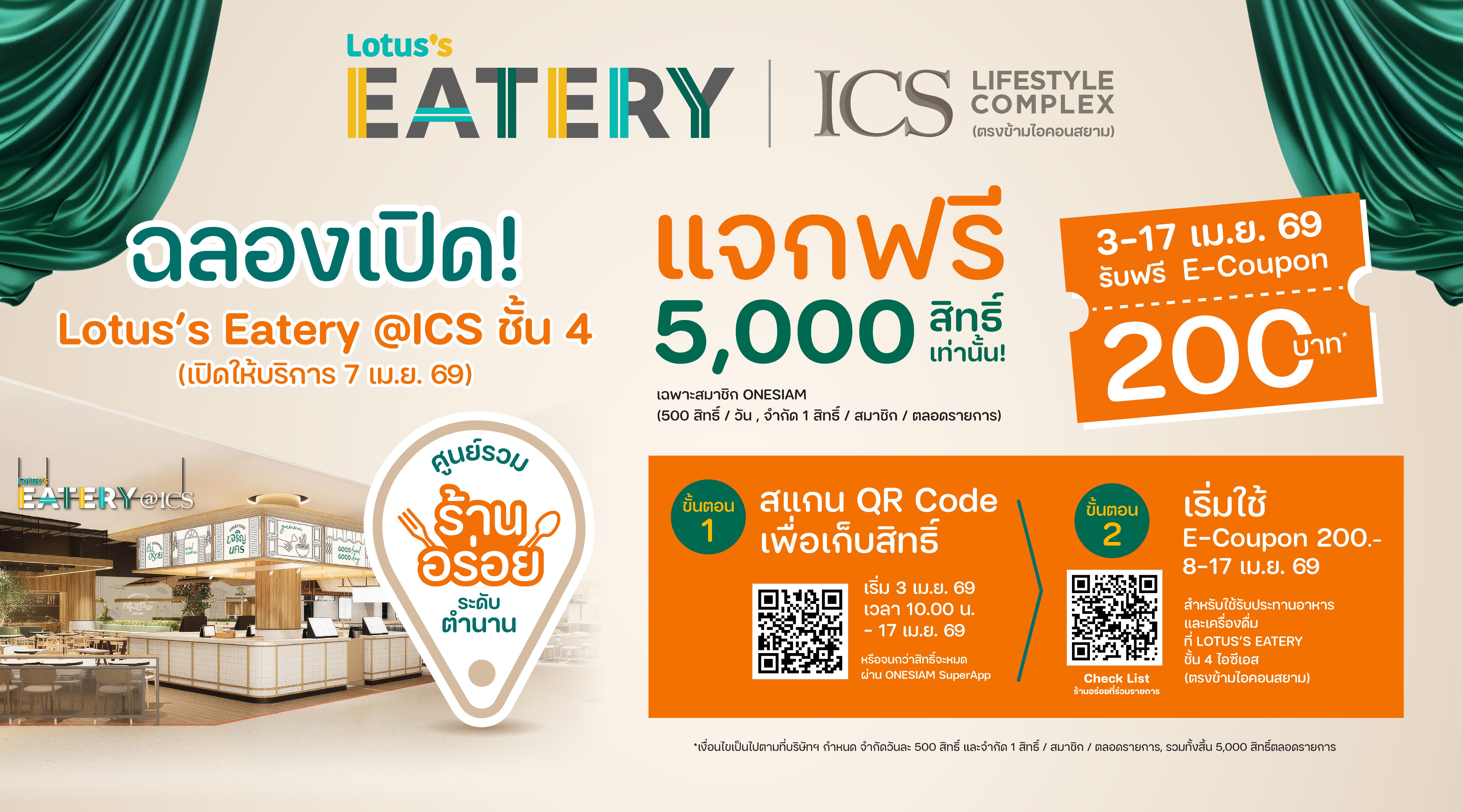 และในโอกาสฉลองเปิดศูนย์อาหารโลตัส อีทเทอรี แอท ไอซีเอส (Lotus’s Eatery @ ICS) สาขาลำดับที่ 200 ของธุรกิจศูนย์อาหารเครือซีพี แอ็กซ์ตร้า (CP AXTRA) ทางศูนย์การค้าไอซีเอส (ICS) ไลฟ์สไตล์คอมเพล็กซ์ เจริญนคร โดยไอคอนสยาม (ICONSIAM) ผนึกกำลังร่วมกันจัดแคมเปญสุดพิเศษเพื่อฉลองการเปิดตัว กับการแจกสิทธิ์ทานอาหารฟรี! จำนวน 5,000 สิทธิ์* (จำกัด 500 สิทธิ์ต่อวัน) สิทธิ์ละ 200 บาทต่อหมายเลขบัตรประชาชน รวมมูลค่ากว่า 1,000,000 บาท เพียงกดรับสิทธิ์และรับ E-Coupon เก็บไว้ใช้งานผ่านแอปพลิเคชัน ONESIAM SuperApp ระหว่างวันที่ 3-17 เมษายน 2569 หรือจนกว่าจำนวนสิทธิ์จะหมด โดยเริ่มกดรับสิทธิ์วันแรก 3 เมษายน 2569 นี้ ตั้งแต่เวลา 10:00 น.เป็นต้นไป (เติมสิทธิ์ทุกวันเวลา 10:00 น. ซึ่งนักช้อปที่กดรับสิทธิ์ได้สามารถนำ E-Coupon มาแลกบัตรเงินสด (Cash Card) ของศูนย์อาหารโลตัส อีทเทอรี แอท ไอซีเอส (Lotus’s Eatery @ ICS) ได้ตามวันที่ระบุภายใน E-Coupon เท่านั้น (ระหว่างวันที่ 8-17 เมษายน 2569)