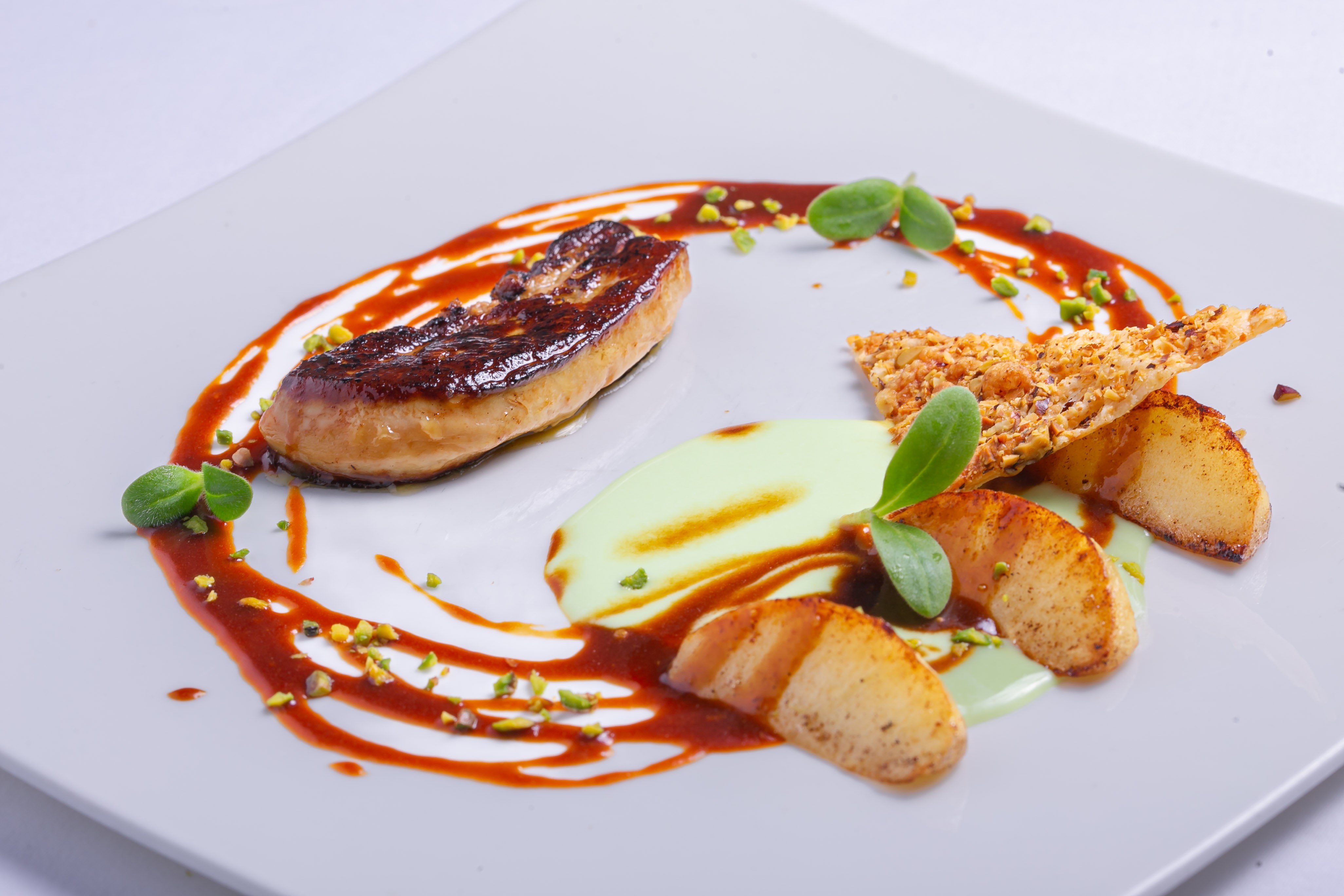 Caramelised Renetta apple, pistachio chips Madeira sauce